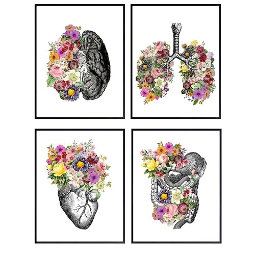 Amazon Com Flower Organs Wall Art Set Of Four Matte 8x10 Inches Floral Anatomy Posters Lungs Skull Brain Heart Retro Wall Decor For Doctors Office Clinic Med